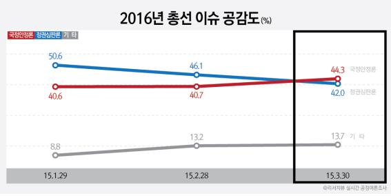 2016총선 이슈 공감도 “국정안정 44.3%(△3.6) vs 정권심판 42.0%(▽4.1)”