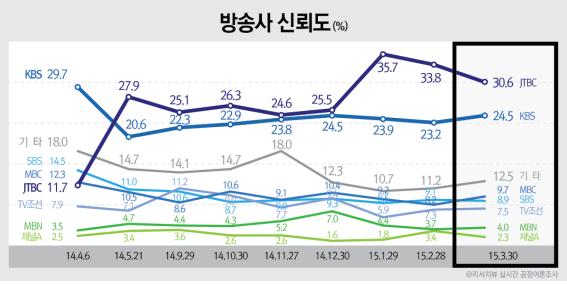 방송사 신뢰도 “JTBC 30.6%(▽3.2) vs KBS 24.5%(△1.3)”