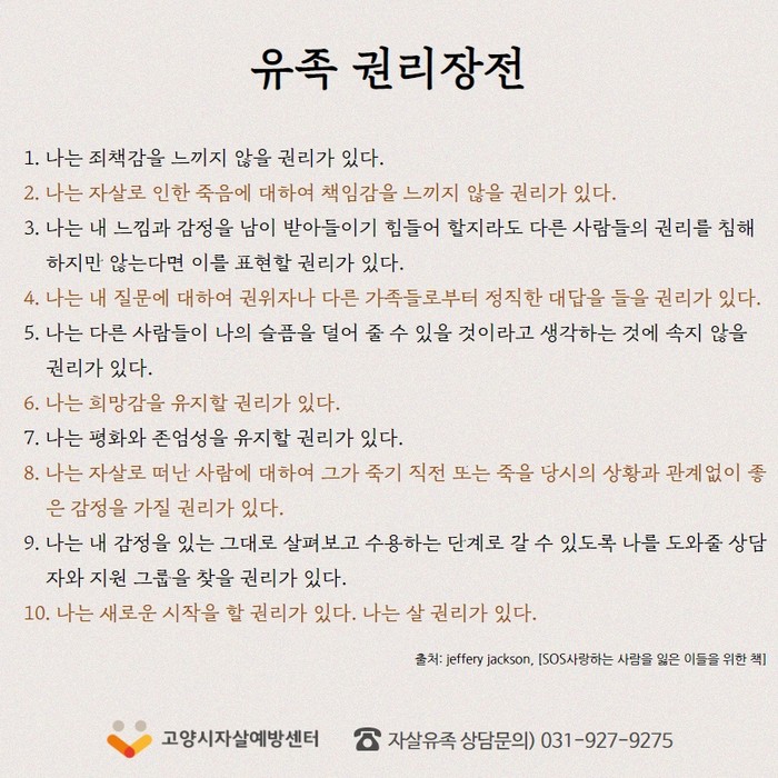 고양시자살예방센터는 자살로부터 안전한 고양시를 실현하기 위해 2019년 2월 27일 개소해 자살예방업무를 전담 추진하고 있으며, 자살유족 상담 및 서비스를 받고자 하는 시민이라면 누구나 고양시자살예방센터(031-927-9275)로 문의하면 된다.
