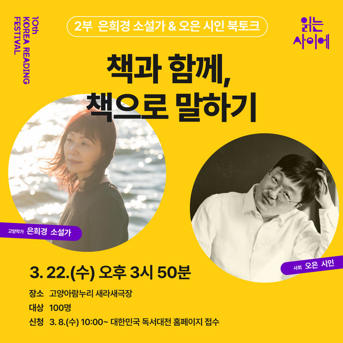 22일 열리는 ‘책의 도시, 고양’ 선포식은 이동환 고양시장을 비롯하여 문화·예술·출판 관계자 및 시민 등 300여 명이 참석한 가운데 ▲책의 도시, 고양 선포 ▲상징기 전달 ▲책의 도시 챌린지 시작 퍼포먼스 ▲축하공연 ▲은희경 소설가와 오은 시인의 북토크 순으로 진행된다.