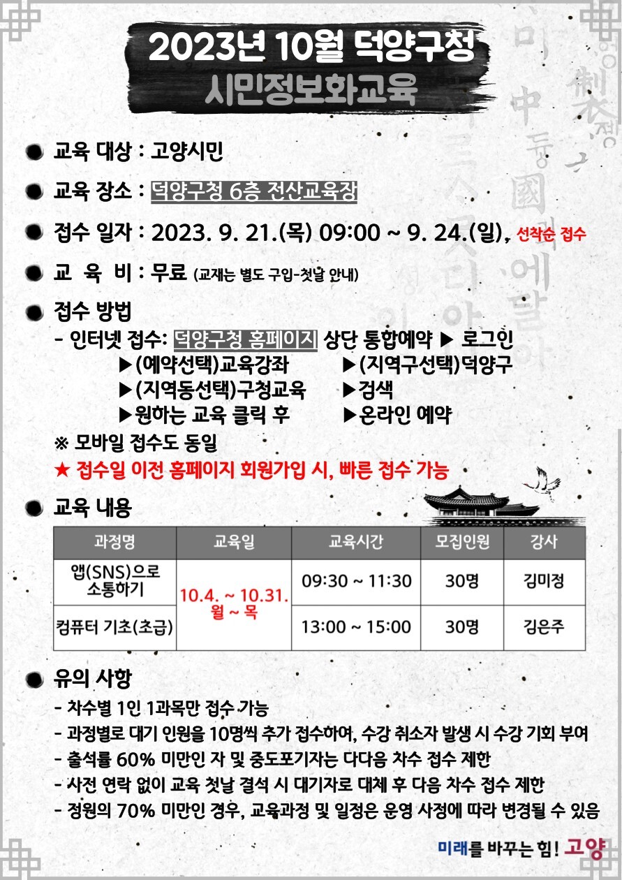 교육은 덕양구청 6층 전산교육장에서 진행되며, 신청은 덕양구청 누리집에서 온라인으로만 가능하다. 각 과정마다 선착순으로 30명씩 모집하며, 덕양구청 누리집 ‘생활정보-교육-정보화교육’또는 상단의 ‘통합예약-교육.강좌-정보화교육’에서 신청할 수 있다.
