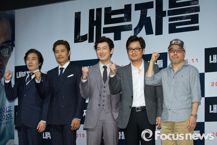 (서울=포컷뉴스) 8일 오전 서울 강남구 논현로 압구정 CGV에서 열린 영화 '내부자들' 제작보고회에 참석한 배우 백윤식(왼쪽부터), 이병헌, 조승우와 영화감독 우민호, 웹툰작가 윤태호가 포토타임을 갖고 있다.