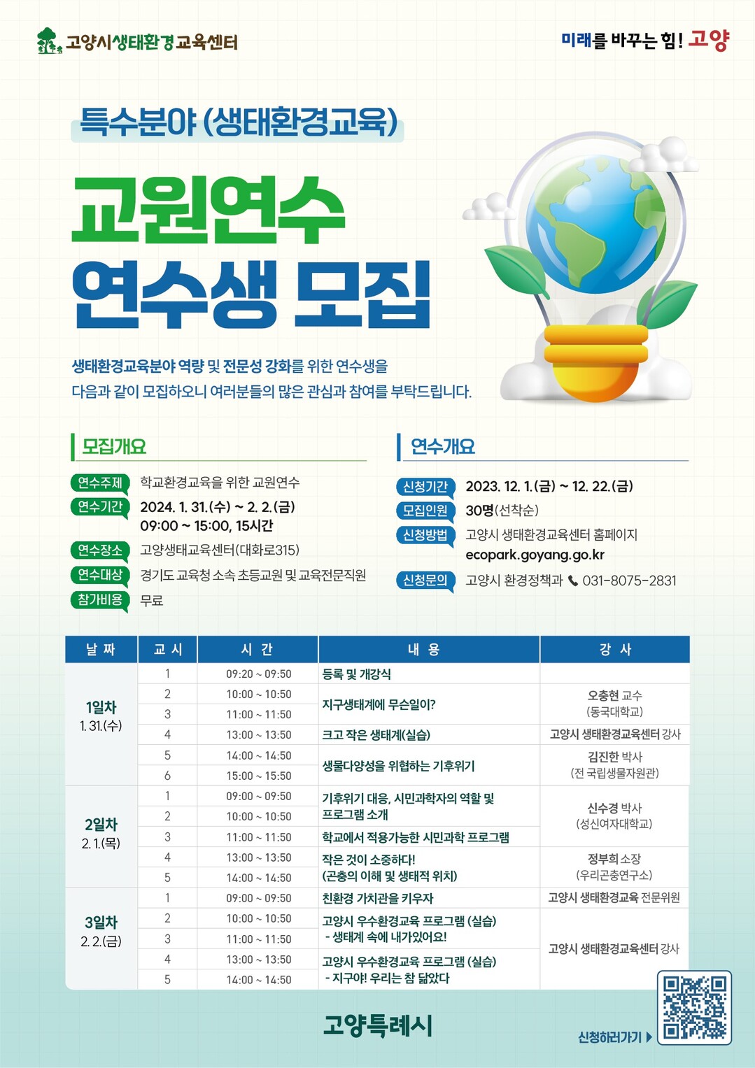 연수 신청은 고양시생태환경교육센터 누리집에서 선착순으로 할 수 있다. 기타 사항은 고양시 생태환경교육센터 누리집을 참고하거나 고양시 환경정책과(031-8075-2831)로 문의하면 된다.