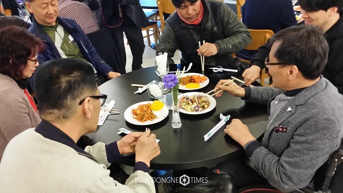 | △(사)한국장애인문화광주광역시협회〔부설〕장애인문화예술지원센터 회장과 장애우들은 감사의 마음으로 맛있는 음식을 함께 하고 있다 |