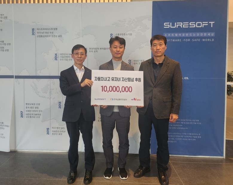 한편, 이번 자동차사고 피해가정 유자녀 자산형성을 위해 공단과 손을 맞잡은 슈어소프트테크(주)는 소프트웨어 품질 전문기업으로 소프트웨어 교육기부 등 다양한 사회공헌활동을 진행하고 있다.