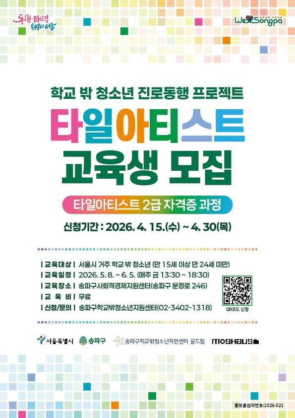 [부자동네타임즈=이병도 기자]  송파구는 서울시 ‘약자와의 동행’ 공모사업으로 학교 밖 청소년들의 사회진입과 자립을 돕기 위한 ‘타일아티스트 교육’을 실시한다고 24일 밝혔다.