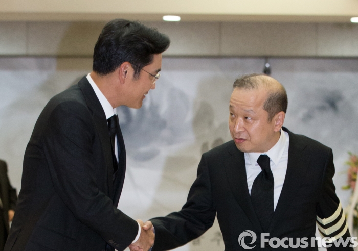 | △ 지난 8월 17일 오후 서울시 종로구 대학로 서울대학교병원 장례식장 故 이맹희 CJ그룹 명예 회장 빈소에서 이재용 삼성전자 부회장과 이재환 재산커뮤니케이션 대표가 악수를 하고 있다. <사진제공=포커스뉴스> |