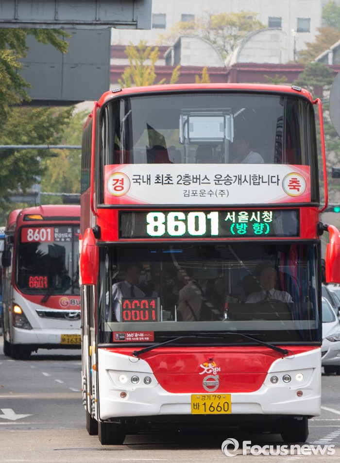 (서울=포커스뉴스) 경기도 광역버스 입석 문제를 해결하고자 도입한 2층 버스가 22일 오후 서울 종로구 세종대로 사거리 인근에서 첫 운행을 하고 있다.