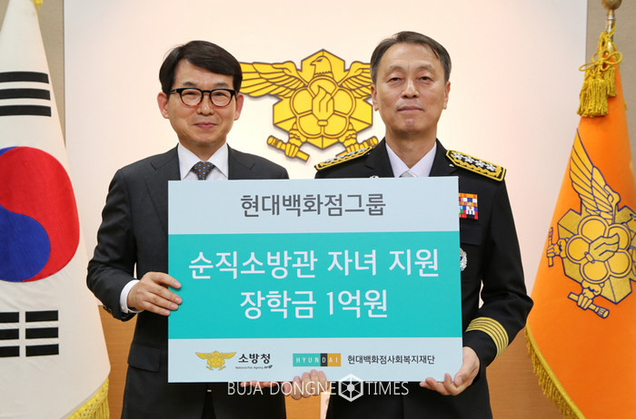 [부자동네타임즈 김현정 기자]27일 세종시 정부청사 소방청에서 박동운 현대백화점 사장(사진 왼쪽)과 조종묵 소방청장이 '순직 소방관 자녀 지원 장학금' 전달식을 마친 뒤 기념촬영을 하고 있다. 앞서 현대백화점그룹 사회복지재단은 지난 2008년부터 10년째 순직 소방관 자녀(초·중·고등학생)를 대상으로 200만~300만원의 학비를 지원하는 '파랑새 장학금' 제도를 운영하고 있다.
