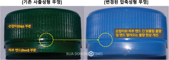 ‘사출성형’ 방식은 금형 틀 안에 수지(원료)를 주입하여 금형 내부에서 ‘캡’을 굳히는 성형기술이며 ‘압축성형’은 금형 틀에 수지를 주입한 후 위아래로 구성된 금형 틀에서 ‘캡’을 찍어내는 방식이다.