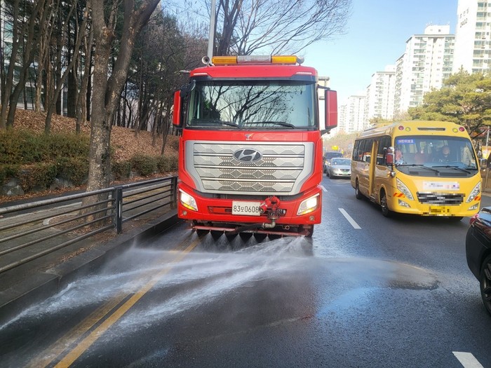 [사진설명] 살수차량이 도로에 물을 뿌리고 있다.
