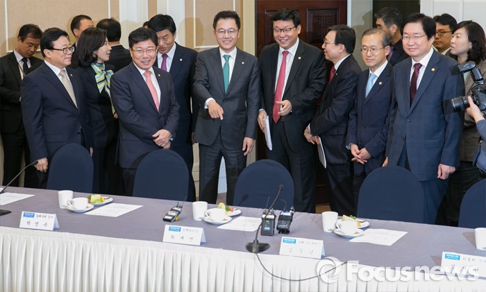 △ 18일 오전 서울 여의도 국회 귀빈식당에서 열린 한중 FTA 여·야·정 협의체 첫 전체회의에 참석한 여당 의원들과 장, 차관들이 야당 의원들을 기다리며 대화하고 있다. 왼쪽부터 이동필 농림축산식품부 장관, 나경원 외교통일위원장, 윤상직 산업통상자원부 장관, 심윤조 외통위 여당 간사, 강석훈 기재위 여당 간사, 주형환 기획재정부 1차관, 문재도 산업통상자원부 2차관, 임성남 외교부 1차관, 김영석 해양수산부 장관. <사진제공=포커스뉴스> |