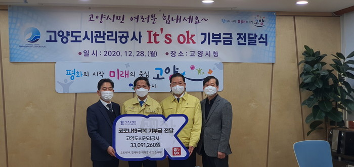 김희영 고양도시관리공사 노조위원장은 “코로나19로 온 국민이 고통 받고 있는 시기에 이를 함께 극복하고자 하는 마음에서 400여명의 노조위원들이 자발적으로 십시일반 성금을 모으게 됐다”고 말했다.