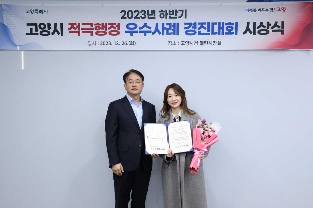 대상은 자동차종합검사 및 무보험 과태료 부과에 대한 고지 방법을 우편에서 모바일로 변경한 차량등록과 공혜림, 정경숙 주무관이 수상했다. 또한 최우수상은 ▲창의적인 노면 버스정류장의 버스정책과 박대준 팀장, 정동균 부팀장 ▲고양시 미래산업의 중추가 될 항공산업(드론, UAM) 플랫홈을 신규 개척한 미래산업과 이용택 팀장, 권오성 주무관이 수상했다.