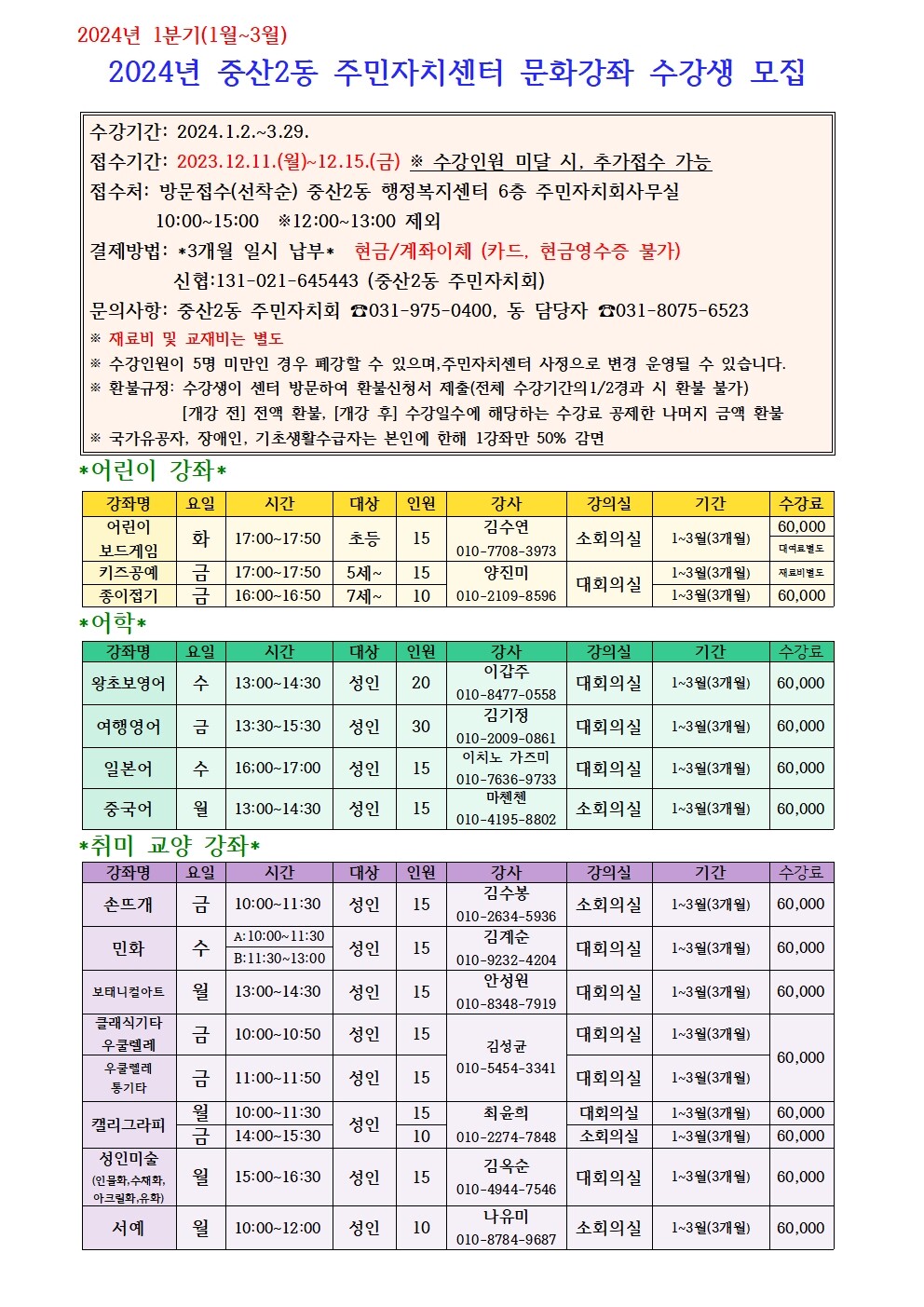 [부자동네타임즈 = 김인수 기자] 고양특례시 중산2동 주민자치회는 오는 12월 11일부터 15일까지 2024년 1분기(1월~3월) 주민자치센터 문화강좌 수강생을 모집한다고 밝혔다.