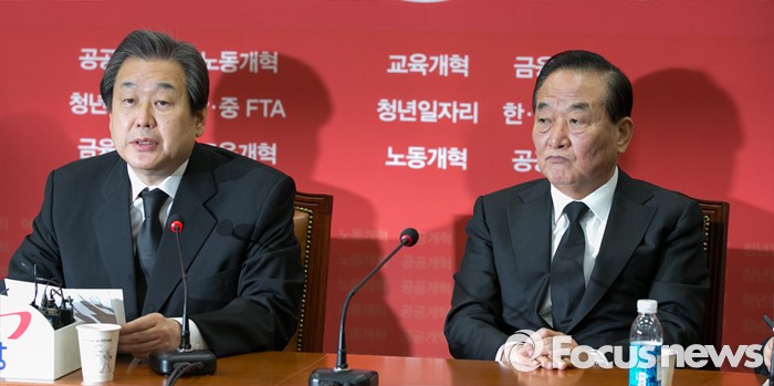 | △ 지난 26일 오전 서울 여의도 국회에서 열린 새누리당 최고위원회의에 김무성(왼쪽) 대표가 참석해 모두발언하는 동안 서청원 최고위원이 경청하고 있다. <사진제공=포커스뉴스> |