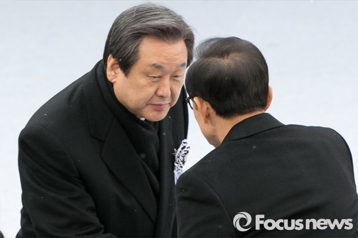| △26일 오후 서울 여의도 국회에서 엄수된 고(故) 김영삼 전 대통령 영결식에 참석한 이명박(오른쪽) 전 대통령과 김무성 새누리당 대표가 악수하고 있다. <사진제공=포커스뉴스> |