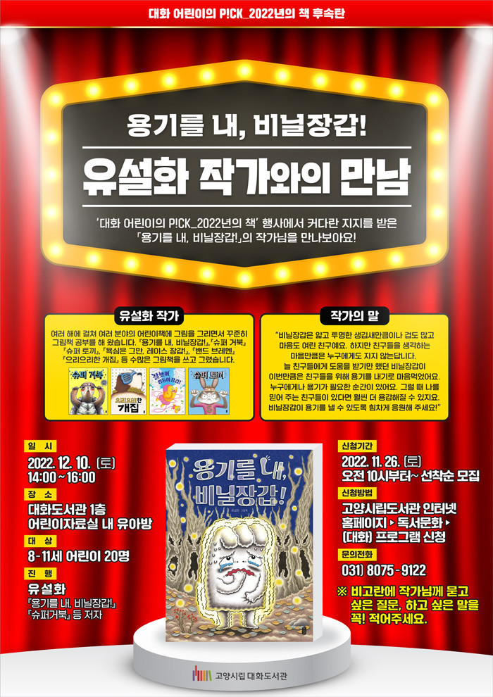 [부자동네타임즈 김인수기자] 고양특례시(시장 이동환) 대화도서관이 오는 12월 10일(토), 어린이자료실에서 용기를 내, 비닐장갑!의 저자 유설화 작가와의 만남을 진행한다.