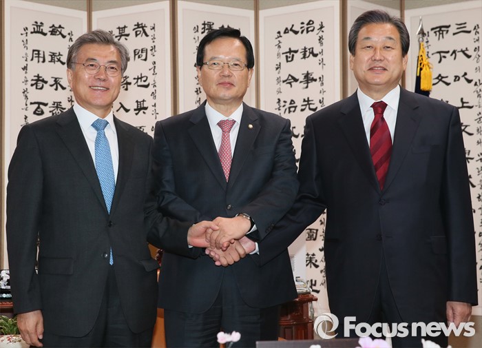 | △ 정의화(가운데) 국회의장과 김무성(오른쪽) 새누리당 대표, 문재인 새정치민주연합 대표가 9일 오후 서울 여의도 국회 의장집무실에서 선거구 획정문제 협의 등을 위해 만나 취재진을 향해 손을 맞잡고 있다. <사진제공=포커스뉴스> |