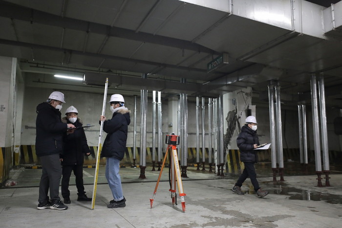 3일에는 건축분야에서 건축구조기술사를 포함해 4명이 레이저레벨기(수평측정기)를 이용해 건물의 구조를 조사해 건물의 바닥, 보, 기둥, 벽체 등의 기울기를 측정하고 처짐현상이 있는지 조사했다.