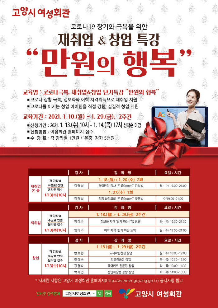 [부자동네타임즈 김인수기자] 고양시 여성회관은, 코로나19 위기상황에서도 재취업과 창업을 준비하는 시민들을 응원하기 위해 모든 강좌의 수강료를 만원으로 책정한 ‘만원의 행복’ 특강 패키지를 이달 18일부터 29일까지 개설한다.