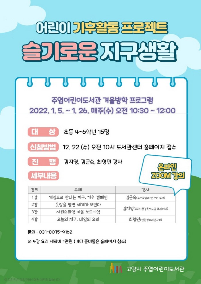 [부자동네타임즈 김인수기자] 고양시 주엽어린이도서관이 겨울방학을 맞은 초등학생을 대상으로 기후활동 체험 프로그램 ‘슬기로운 지구생활’을 운영한다.
