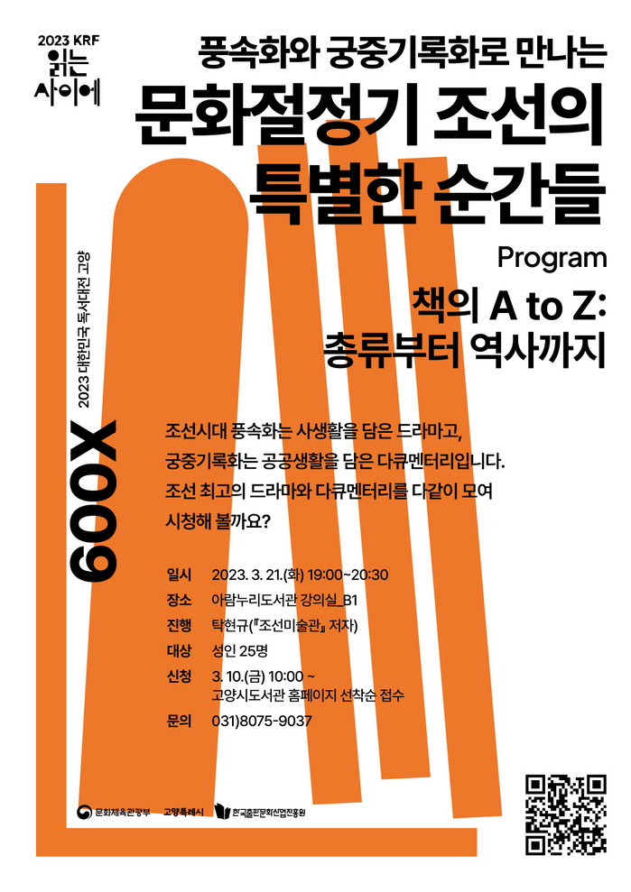 아람누리도서관에서는 올해 2월에 나온 작가의 신간 『조선미술관(풍속화와 궁중기록화로 만나는 문화 절정기 조선의 특별한 순간들)』을 통해 조선 후기 백성의 다채로운 일상을 담은 풍속화부터 왕실과 상류사회의 경사스러운 행사를 그린 기록화까지, 아름다운 옛 그림과 역사를 생생하게 만나는 시간을 가진다.