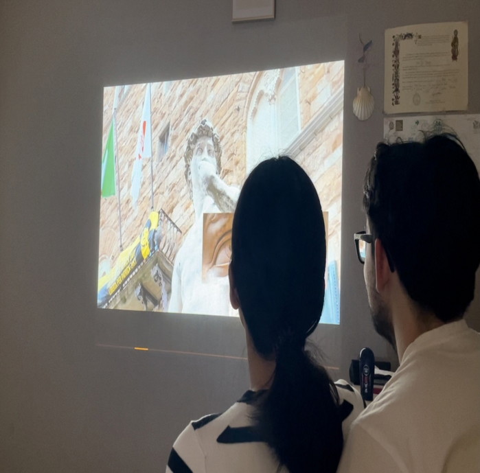 최영인 투어가이드는 피렌체 현장과 미리 준비한 자료화면을 동시에 띄워 설명했다. 또한 여행자들의 실시간 궁금사항과 요구사항을 반영해 베키오다리 골목의 보석상을 보여주기도 하고, 유명한 초코렛전문점에서 티라미수를 직접 사며 맛보고 전하는 생생한 현장감도 더했다.