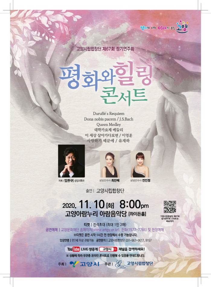 시 관계자는, “이번 고양시립합창단 제67회 정기연주회가 코로나19로 지친 고양시민들의 심신을 위로하고 다가올 희망찬 내일을 노래하는 문화의 장이 되리라고 기대한다”며, “108만 고양시민 누구나 함께 할 수 있도록 전석 무료 초대로 진행하니 많은 관심과 참여 부탁드린다”고 말했다.