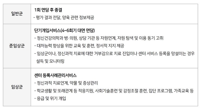 정신건강상담은 정신건강전문요원이 맡는다. 상담을 통해 정신병리 문제, 정신건강의학과 진료, 지속적인 사례관리 서비스 필요성 여부를 알 수 있으며 평가 결과에 따라 맞춤형 서비스를 제공한다.