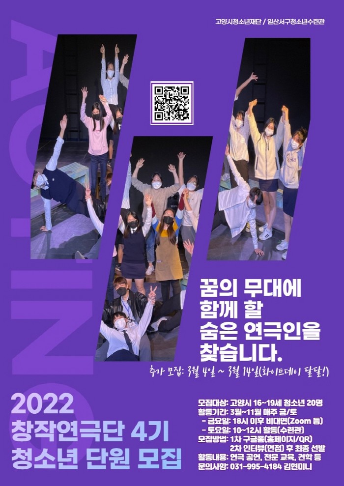 [부자동네타임즈 김인수기자] 고양시청소년재단 산하 시설 일산서구청소년수련관에서는 연극이라는 매체를 활용하여 자신을 표현하고, 소통하며 긍정적인 성장을 목표로 운영 중인 창작 연극단의 4기 단원 청소년(16~19세)을 모집한다. 창작 연극단은 2019년 처음 창단된 일산서구청소년수련관의 중점사업 중, 하나로 고양형 혁신 교육 사업 다함께 교실과 연계하여 운영하고 있다.