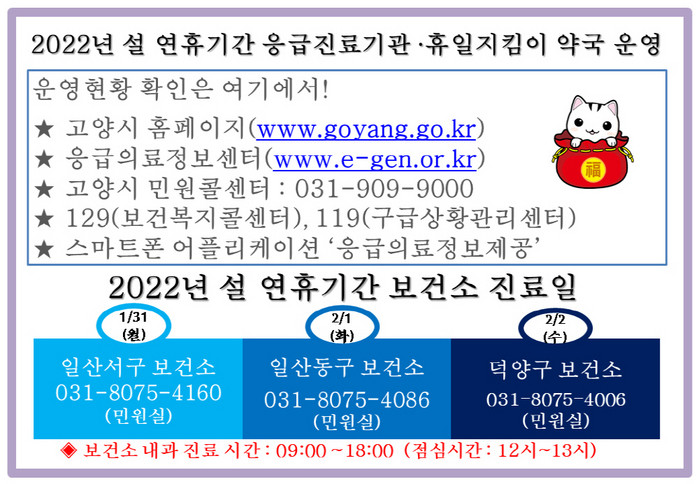 설 연휴 내 의료기관 및 약국 운영 여부와 구급차 출동, 코로나19 선별진료소 등에 대한 문의는 보건소(덕양구보건소, 일산동구보건소, 일산서구보건소와 고양시민원콜센터, 구급상황관리센터, 보건복지콜센터로 하면 된다.
