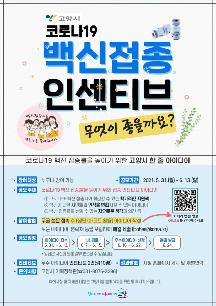 [부자동네타임즈 김인수기자] 고양시가 코로나19 백신 접종 부작용에 대한 시민들의 불안을 해소하고 백신접종률을 높이기 위해 오는 13일까지 ‘백신접종 인센티브 한 줄 아이디어’시민 공모를 진행한다.