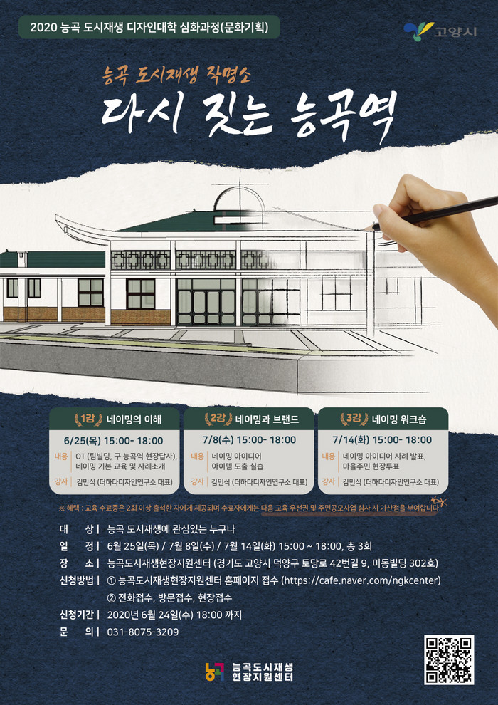 교육신청은 오는 24일까지 능곡 도시재생현장지원센터 홈페이지를 통해 온라인으로 접수하거나 센터방문, 전화 등 오프라인 접수도 가능하다. 정원 미달 시 현장접수도 가능하다.