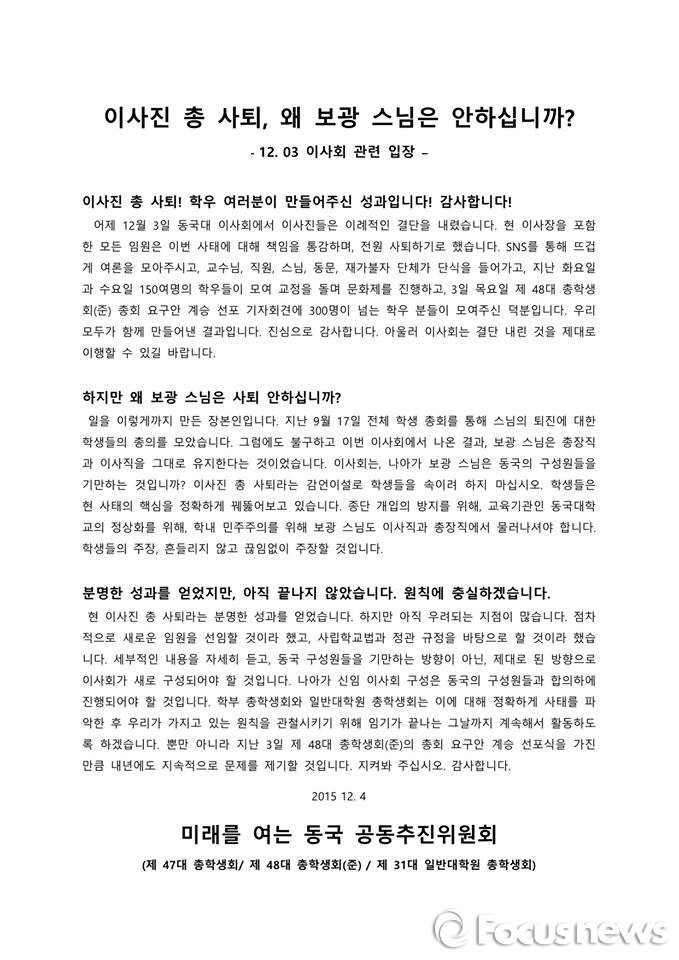 | △ 3일 동국대 이사 전원 퇴진 결의에 대한 동국 공동추진위원회 입장 발표문. <사진제공=동국 공동추진위원회> |