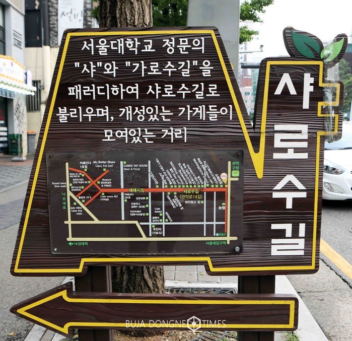 ‘샤로수 길’은 서울 관악구 관악로 14길을 일컫는 별칭이다. 서울대입구역 2번 출구로 나와 ‘샤로수 길’이라 적힌 표지판을 따라 걷다보면 골목길 입구부터 약 500m 거리까지 특색 있는 상점들을 구경하기 위해 붐비는 사람들을 볼 수 있다.