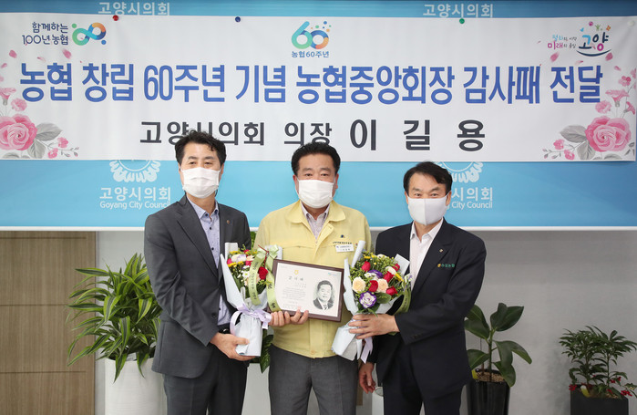 [부자동네타임즈 김인수기자] 고양시의회 이길용 의장이 지난 7월 26일 농협 고양시지부와 원당농협으로부터 감사패를 받았다.