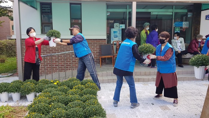 부쩍 선선해진 날씨였지만 국화꽃을 심는 통장협의회 회원들의 이마에는 구슬땀이 흘렀다. 노란 얼굴을 살짝 내밀거나 꽃망울이 채 터지지 않은 국화들이 정성어린 손길을 따라 화단에 자리를 잡았다.