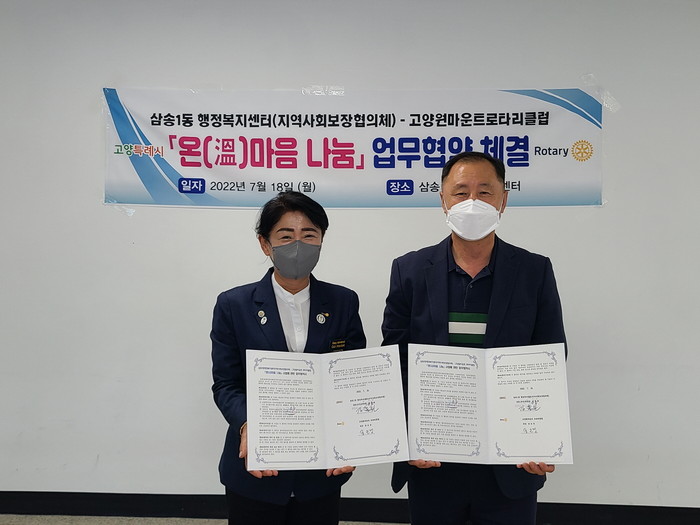[부자동네타임즈 김인수기자] 고양특례시 삼송1동행정복지센터(동장 김동원)는 지난 18일, 고양원마운트 로타리클럽(회장 송은경)과 관내 저소득 및 취약가구의 복지증진과 주거환경 개선 등 맞춤형복지 지원을 위해 「온(溫)마음 나눔」 업무협약을 체결했다고 밝혔다.