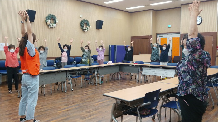 [사진설명] 건강한 행복마을 참여 어르신들이 스트레칭을 하고 있다.