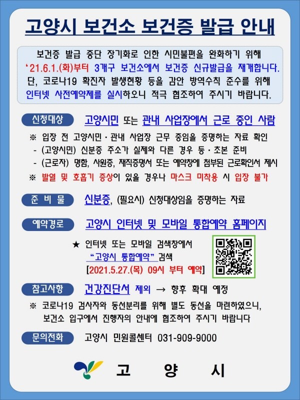 [부자동네타임즈 김인수기자] 고양시가 "3개구 보건소는 보건소 건강진단결과서(구 보건증) 발급 업무를 내달 1일부터 재개한다."고 밝혔다.