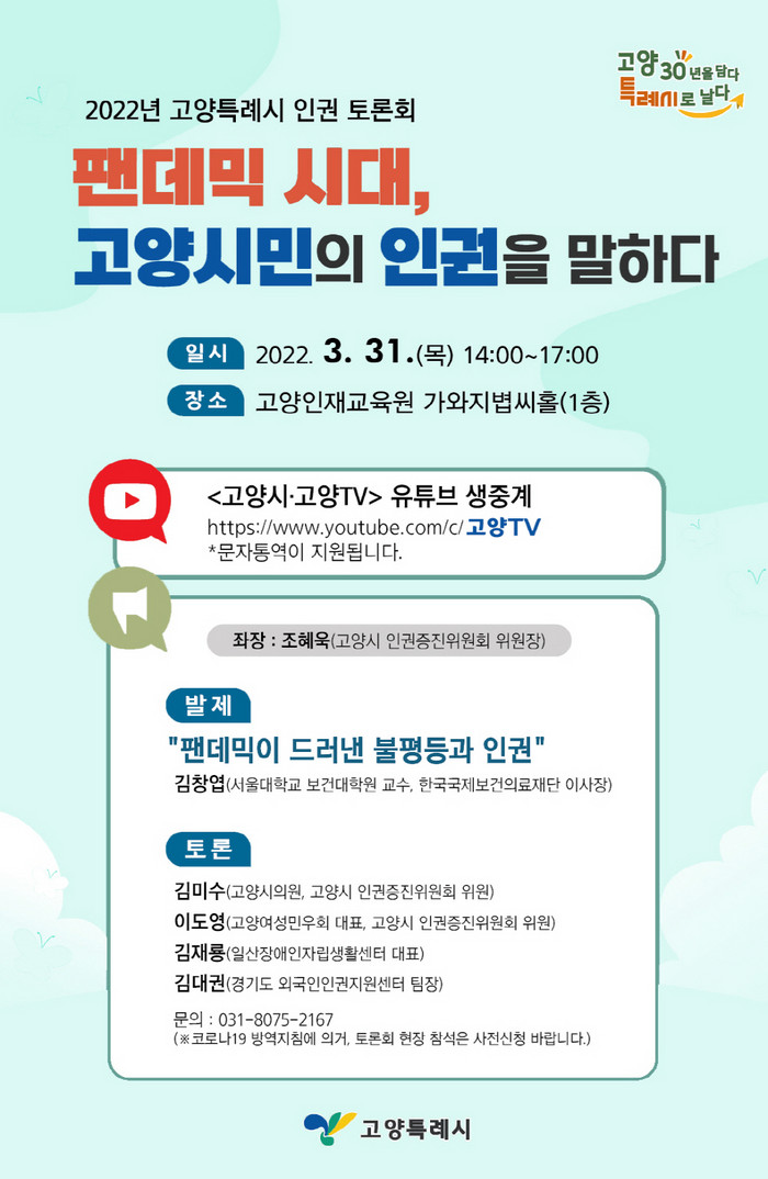 [부자동네타임즈 김인수기자] 고양시가 3월 31일 오후 2시 고양인재교육원에서 ‘팬데믹 시대, 고양시민의 인권을 말하다’주제로 토론회를 개최한다. 토론회는 고양시 유튜브 ‘고양시·고양TV’에서 생중계될 예정이다.