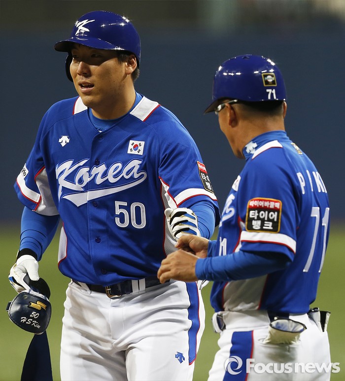 | △ 지난 5일 오후 서울 구로구 고척스카이돔에서 열린 2015 서울 슈퍼시리즈 대한민국과 쿠바의 2차전에서 5회초 2사, 이대호 타선에 김현수가 대타로 나와 안타를 친 후 코치와 하이파이브를 하고 있다. <사진제공=포커스뉴스> |