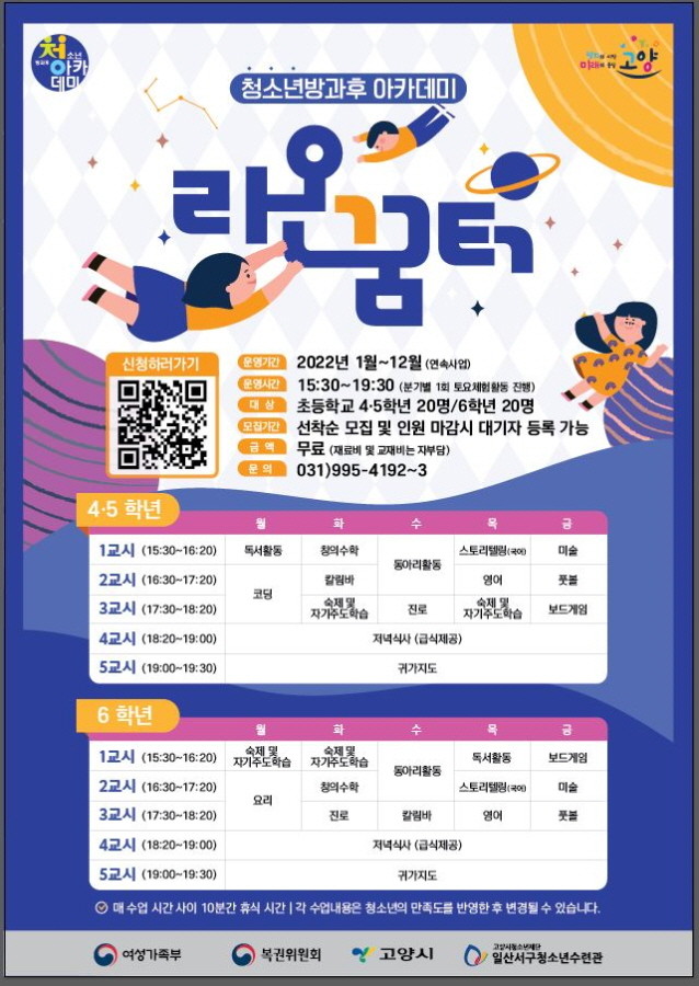 [부자동네타임즈 김인수기자] 고양시청소년재단(이사장 이재준) 산하기관인 일산서구청소년수련관 청소년방과후아카데미 라온꿈터에서 2022년 참가 신규 청소년을 모집한다.
