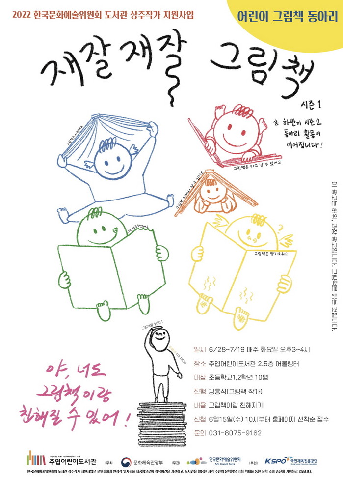 주엽어린이도서관은‘2022년 도서관 상주작가 지원사업’에 선정돼 김흥식 그림책 작가와 함께 다양한 문학 프로그램을 진행하고 있다. 이번에는 그림책의 매력을 느낄 수 있는 동아리 양성 프로그램인 어린이를 위한‘재잘재잘 그림책’ 동아리와 성인 대상‘공부하는 그림책’ 동아리를 시즌제로 운영할 예정이다.