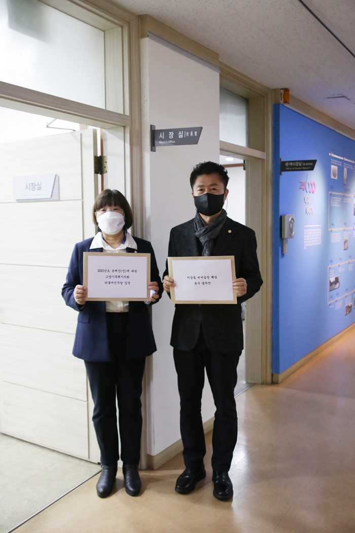 [사진설명] 고양시특례시의회 더불어민주당 (당대표 김미수의원, 이종덕의원)이 2023년도 본예산(안)에 대한 고양시특례시의회 더불어민주당 입장, 이상동 비서실장 해임 촉구 결의안를 고양특례시 이동환 시장에게 전달하고 있다.
