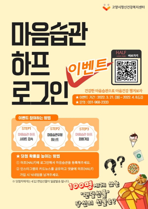 [부자동네타임즈 김인수기자] 고양시 정신건강복지센터(센터장 이정석)가 3월 21일부터 4월 8일까지 마음습관 프로그램 ‘하프(HALF)’ 로그인 이벤트를 개최한다.