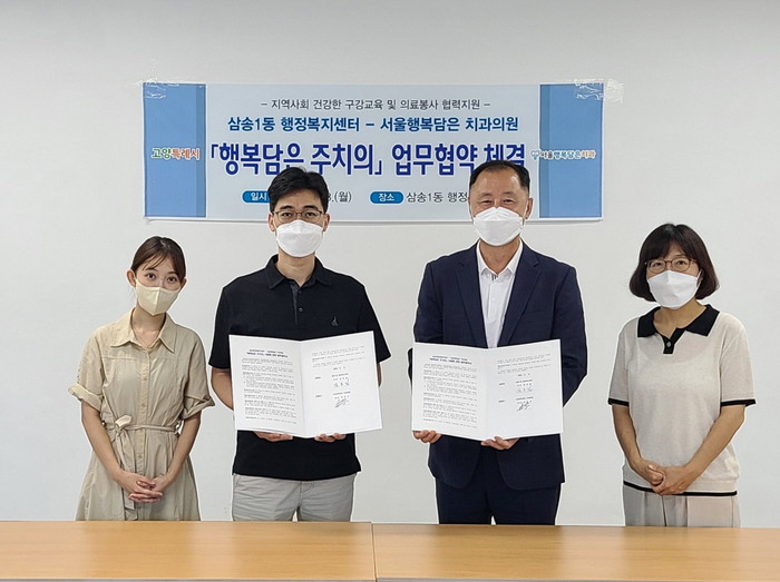 [부자동네타임즈 김인수기자] 고양특례시 삼송1동행정복지센터(동장 김동원)는 지난 8일, 저소득 및 취약가구 대상 의료 봉사 및 지역주민의 구강 건강 관리를 위해 서울행복담은치과의원(원장 박철우)과 ‘행복담은 주치의’ 업무협약을 체결했다.
