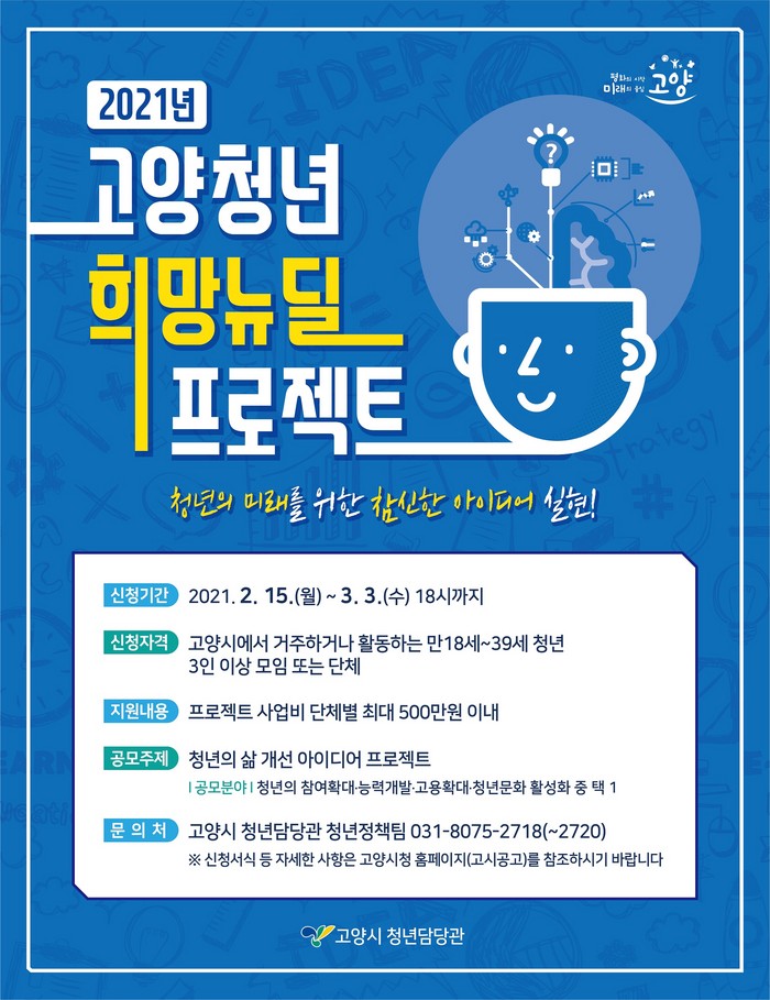 [부자동네타임즈 김인수기자] 고양시가 청년 주도의 청년정책 발굴과 사회참여 역량 개발을 지원하기 위해 오늘(15일)부터 ‘2021년 고양 청년 희망뉴딜 프로젝트’ 공모사업을 진행한다.