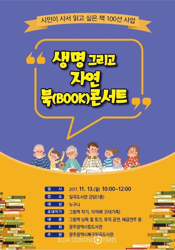 북구는 오는 13일 오전 10시부터 일곡도서관 강당 1층에서 그림책 '5대 가족'의 저자 이억배 작가를 초청해 '책과 음악이 있는 북 콘서트'를 개최한다고 9일 밝혔다.